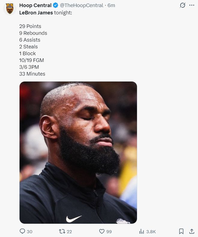 全場比賽詹姆斯34分鐘,18中10,三分5中3,拿到29分9籃板6助攻2搶斷1蓋帽,命中率52.6%,三分命中率50%,下半場詹姆斯19分7籃板5助攻,老頭太不容易了。