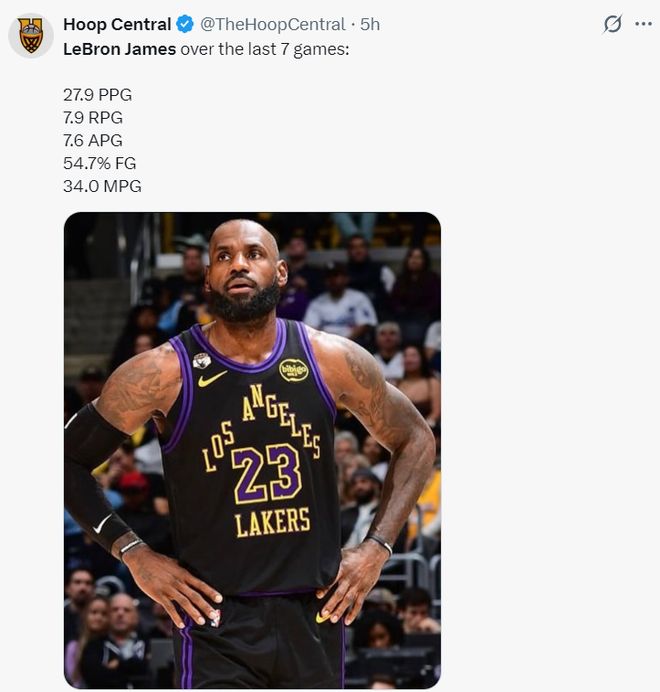41歲后的勒布朗場均34分鐘,拿到27.9分7.9籃板7.6助攻,命中率54.7%,可以說他已經(jīng)付出一切。