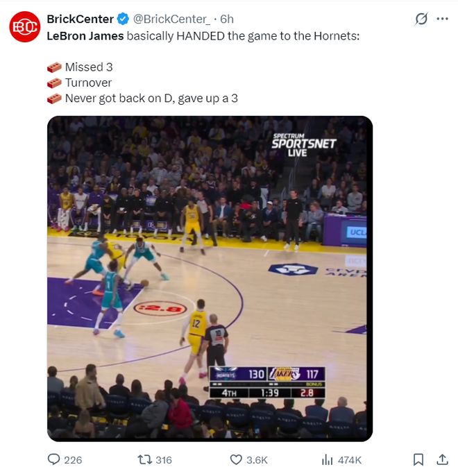 美媒BC曬出最后1分50秒-1分39秒,詹姆斯三分不中,湖人拼下前場籃板,隨后詹姆斯突破失誤,緊接著詹姆斯沒有退防讓黃蜂輕松反擊命中三分,詹姆斯這個(gè)回合導(dǎo)致湖人功虧一簣。
