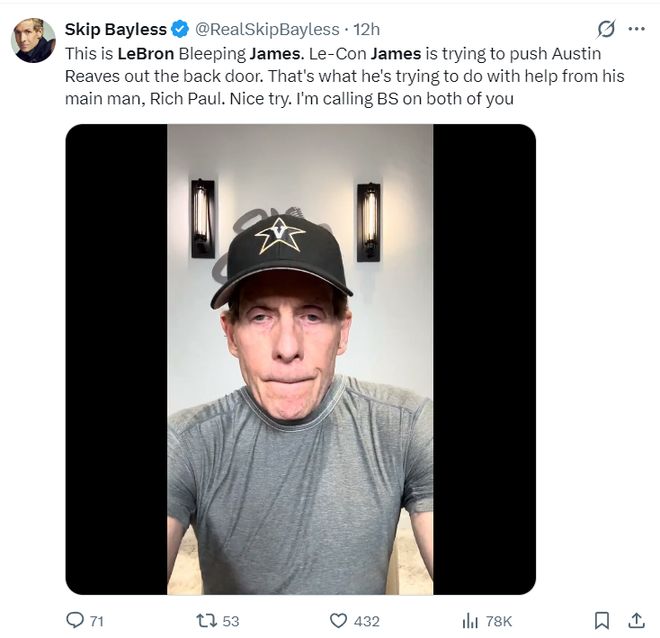 聯(lián)盟‘金牌詹黑’斯利普-貝勒斯還在直播間詆毀詹姆斯,他說道:勒布朗正試圖用后門把奧斯汀-里夫斯趕走,他利用他的經(jīng)紀(jì)人里奇-保羅從中作梗,這就是勒布朗正在做的事,他兩人的企圖讓我無法信任。(老詹是公開聲援希望小里留下的,詹黑的詆毀太令人無奈)