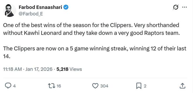 正如賽后快船記者Farbod Esnaashari所說:“這是本賽季快船最精彩的勝利之一,他們在缺少小卡的情況下,逆轉擊敗強敵猛龍?!?/p>