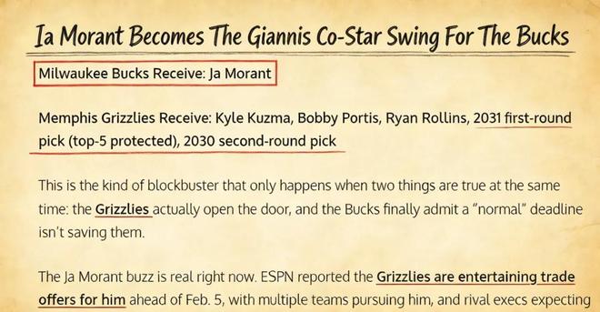 美媒《Fadeaway World》撰文建議,雄鹿應該考慮打包送出庫茲馬、波蒂斯、羅林斯以及2031年的首輪簽(前5保護)、2030年的次輪簽,從灰熊引入莫蘭特。