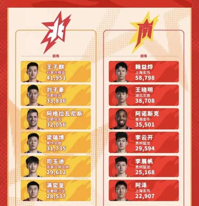 從NBL官方公布的投票統計結果來看,賴益燁以58798票暫列南區第一,比南區排名第二的湖北隊長王曉明多了20000多票,比目前北區票王來自石家莊的王子麒的票數足足多了16000多票……