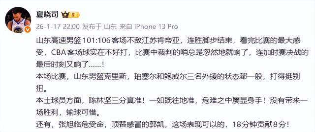 作為山東媒體人,夏曉司老師是會這樣說的,“看完比賽的最大感受,CBA客場球實在不好打,比賽中裁判的哨總是忽然地就響了,連加時賽決戰(zhàn)的最后時刻又響了……”顯然,他覺得是裁判的問題。