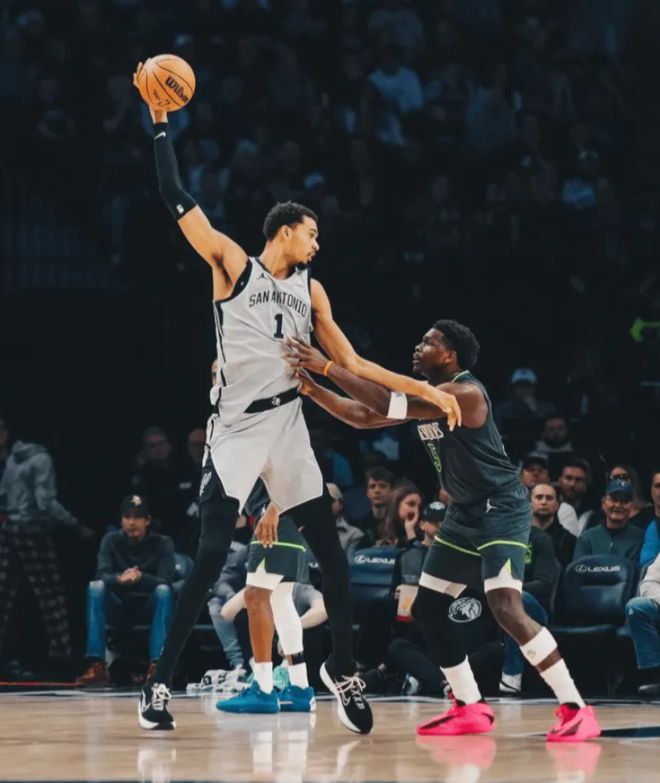 次節回來,卡斯爾和哈珀分別命中三分,馬刺反超比分。森林狼連續打鐵不中還出現低級失誤,科內特反擊再打進,馬刺轟出一波30-13,三次打停森林狼。愛德華茲提前登場連續兩記標志性后仰跳投,穩住局勢,文班頂著防守硬拔,連續轟進不講理三分,單節已砍下16分,馬刺三分9中5已經領先森林狼20分。愛德華茲和蘭德爾連續失誤丟球,卡斯爾文班再中三分,半場戰罷,馬刺69-44領先森林狼25分。