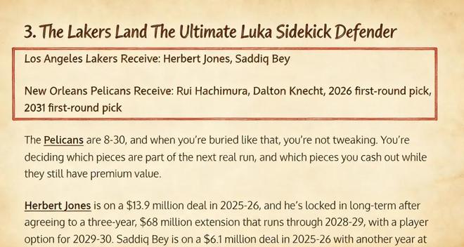 美媒《Fadeaway World》撰文建議,湖人應該打包將八村壘、克內克特、2026年首輪簽以及2031年首輪簽送到鵜鶘,換回對面的前鋒瓊斯和薩迪克·貝。