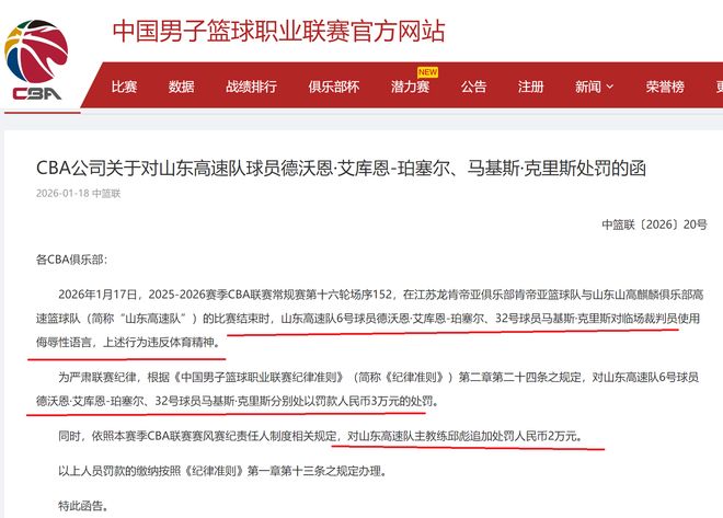 針對此事,CBA公司在賽后,也是進(jìn)行了調(diào)查,確定山東隊德沃恩·艾庫恩-珀塞爾、馬基斯·克里斯對當(dāng)值裁判使用了侮辱性語言,他們的這種行為,嚴(yán)重違反了體育精神。因此,根據(jù)CBA聯(lián)賽的相關(guān)規(guī)則,對德沃恩·艾庫恩-珀塞爾、馬基斯·克里斯兩人分別罰款30000元。
