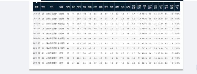 CBA生涯前三個賽季,賀希寧場均得分僅有個位數。來到深圳男籃后的五個賽季,他的場均得分從9.9分階梯式攀升至15分。23-24至24-25賽季,他已能將場均得分穩定在16分左右。本賽季,賀希寧再次實現突破,場均得分暫時來到19.8分。