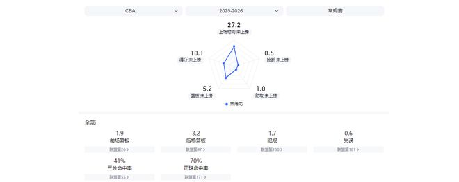 16次出場后,焦海龍場均可為球隊貢獻10.1分5.2籃板1助攻,投籃命中率62.1%,三分命中率41.4%。這兩項命中率數據,均創下了他職業生涯出場次數超過2場的賽季新高。