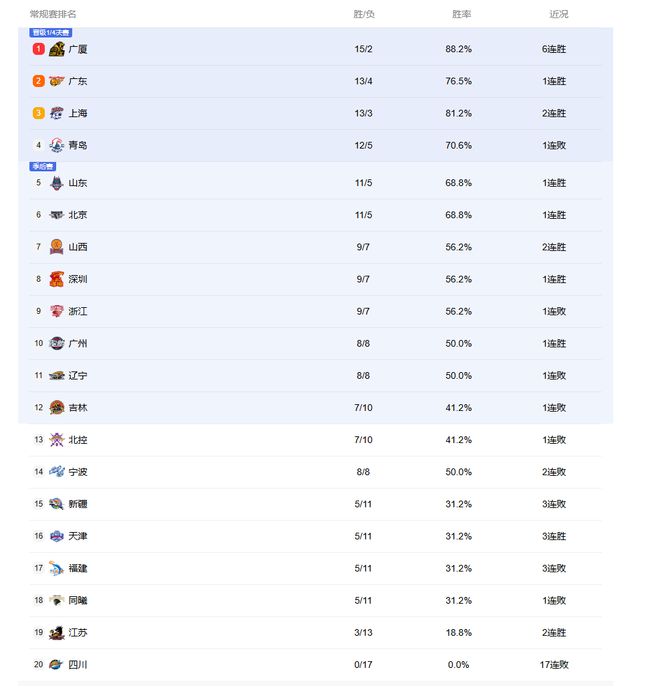 北京時間1月20日,CBA聯賽第17輪首個比賽日正式結束,聯賽積分榜又有新變化!廣東宏遠28分大勝四川男籃,取得隊史第1000場勝利,同時他們也拿到了本賽季的第30個積分,力壓29積分的上海男籃排名積分榜的第2位!浙江廣廈穩如泰山,擊敗單外援的青島男籃后豪取6連勝,目前仍然是積分榜頭名。上海、青島和山東分列第3至第5,北京男籃排名第6。近來狀態不錯的山西和深圳排在第7和第8。遼籃則排名第11位,險些跌出季后賽圈。