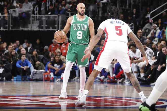 中場休息回來,凱爾特人反撲追到僅差1分,鄧羅三分開火一度維持67-64領先,凱爾特人連得4分。雙方持續交替領先纏斗,持續拉鋸戰鏖戰至82-82,哈里斯拉桿上籃命中。活塞單節25-31輸掉6分,三節結束活塞僅84-82領先凱爾特人。前三節比賽,活塞三分命中數6-12落后,哈里斯19分、杜倫18+8、坎寧安12+10與鄧羅12分;布朗22+9、豪澤與普里查德均16分。