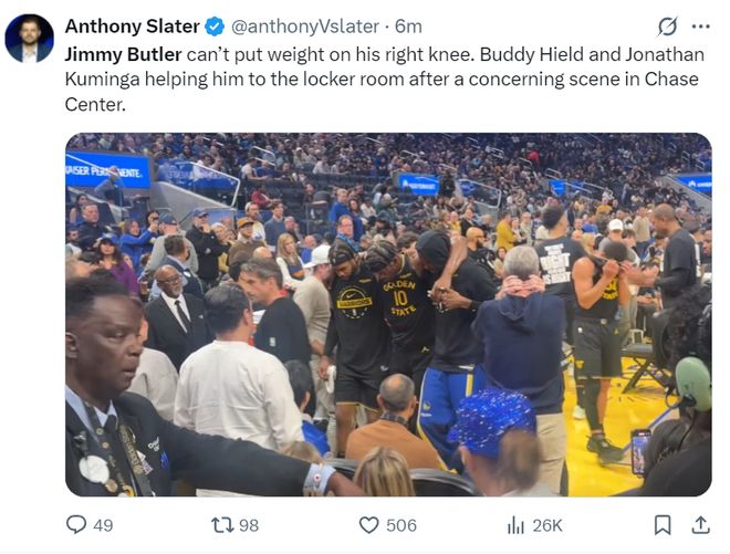 勇士記者安東尼-斯萊德發(fā)來最新消息,巴特勒的右膝無法負(fù)重,他進(jìn)入更衣室是在希爾德、庫明加的攙扶下。