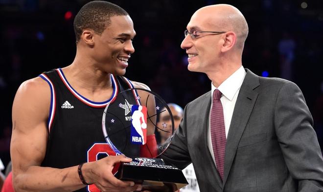 威少生涯至今,共9次入選全明星,其中2次成為首發球員。盡管入選的次數和首發都不及其他球員,但威少還是把握機會,連續兩屆(2014—15、2015—16賽季)都拿到MVP,成為NBA歷史第一人。