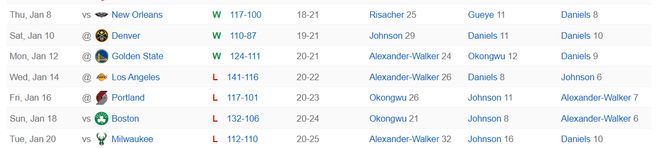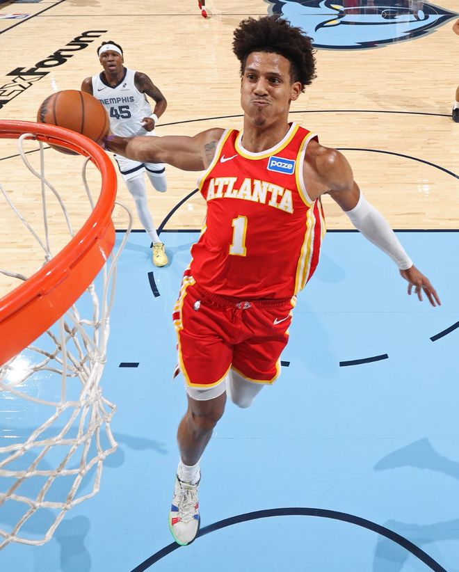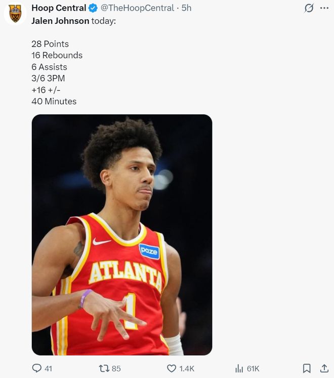 杰倫-約翰遜是新鷹王,他此役40分鐘,24中11,三分6中3,罰球6中3,拿到28分16籃板6助攻1蓋帽,命中率45.8%,三分命中率50%,但球隊(duì)卻沒(méi)有給他最后一投設(shè)置戰(zhàn)術(shù)。