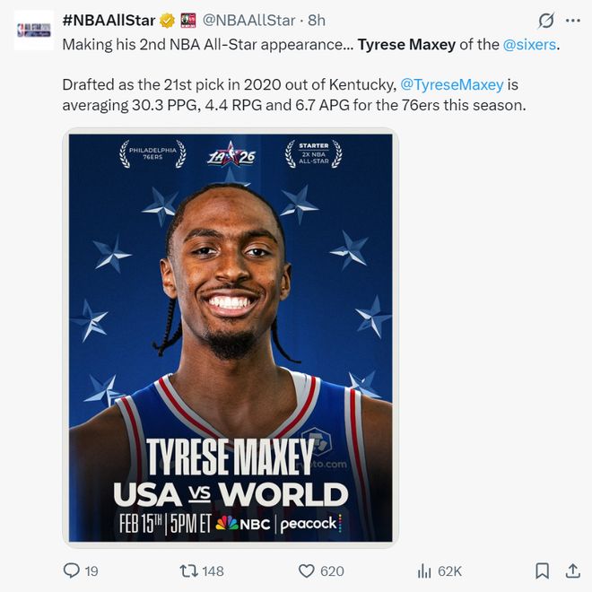 馬克西的球迷投票第二,球員投票第五,綜合是東部第三,馬克西本賽季的表現擔得起全明星先發。