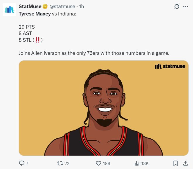 4.馬克西單場29+8+8搶斷是費城隊史自艾弗森后第二人。