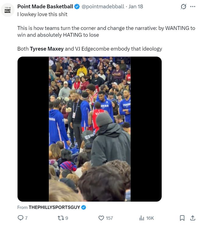 兩天之前,費城與騎士的比賽中埃奇庫姆、馬克西兩人曾在板凳席上發生激烈的爭吵,雖然曝出兩人有矛盾。