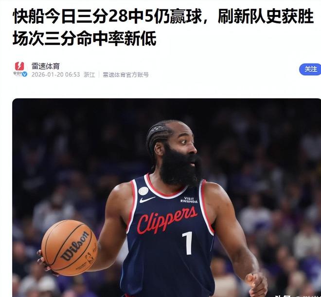雷速體育(快船今日三分28中5仍贏球,刷新隊史獲勝場次三分命中率新低2026.01.20)