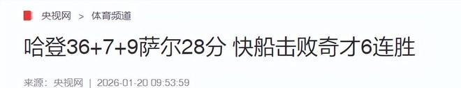 央視網(哈登36+7+9薩爾28分 快船擊敗奇才6連勝2026.01.20)