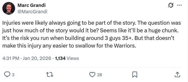正如灣區(qū)記者Marc Grandi所說:“當(dāng)你圍繞三個35歲以上的球員建隊時,傷病似乎注定會成為故事的一部分,這就是你必須承擔(dān)的風(fēng)險。”