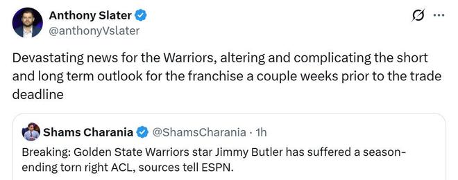 勇士隊記Slater也跟進一針見血的指出,這對于勇士隊是一個心碎的消息,也會讓勇士隊在交易截止日的短期與長期計劃均發(fā)生復(fù)雜的改變。