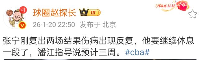險勝遼寧男籃的比賽后,潘江介紹了張寧的傷病情況,由于拉傷出場了反復,張寧需要休息三周的時間,由于隨后會進入窗口期,張寧有一個比較長的時間進行康復。