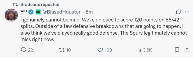上半場打完火箭已經落后10分,休媒Will寫道:我沒辦法為落后生氣,因為我們朝著120分前進,除了幾次防守漏人與失誤我覺得我們做的不錯,馬刺就是怎么投怎么進。