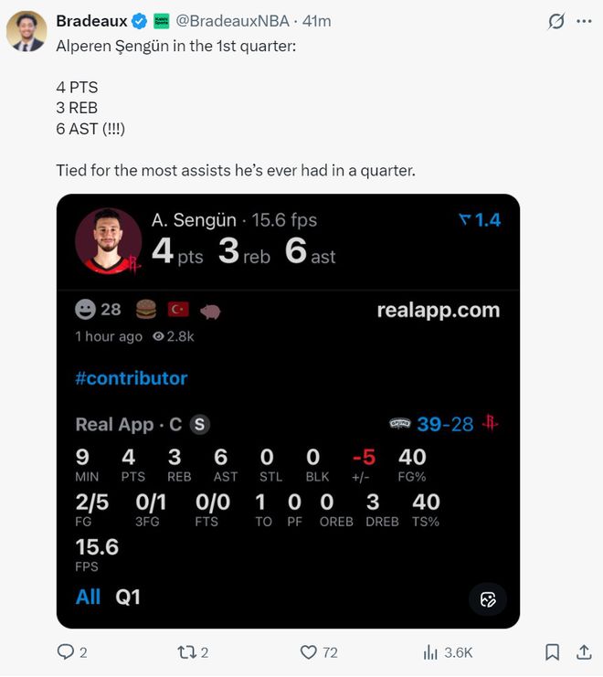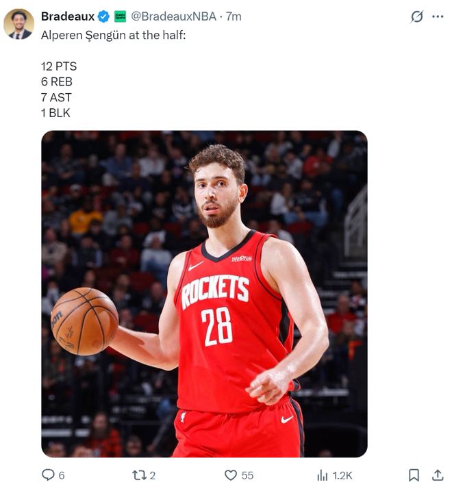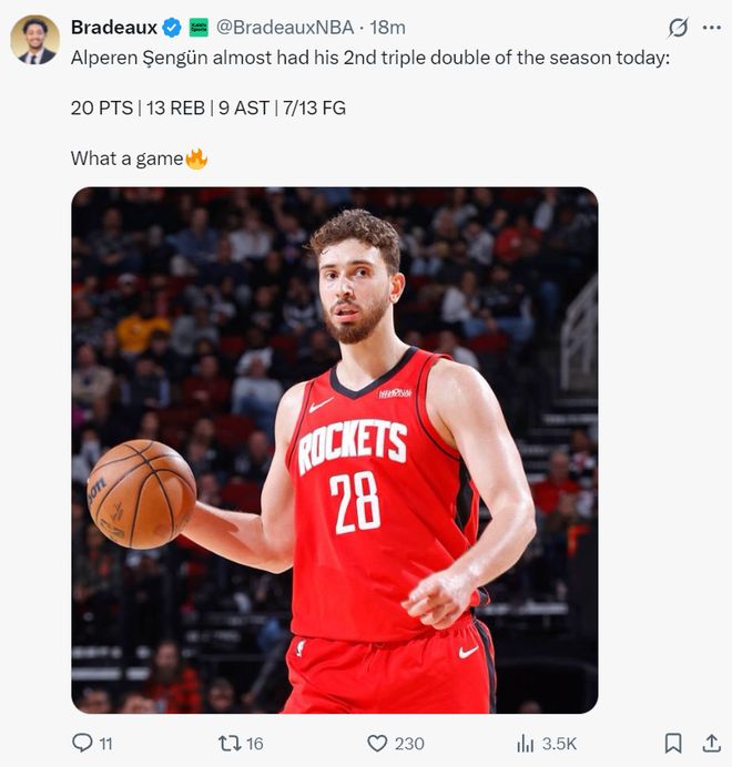 火記Bradeaux:申京今晚在場上移動得極為出色。為火箭隊貢獻了全方位的表現,他只需要做好自己就行。