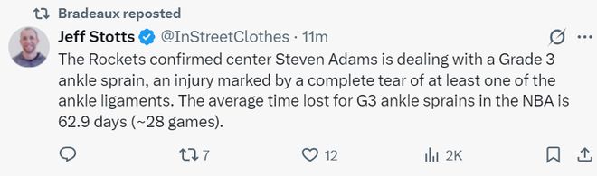 在這場比賽期間,火箭記者杰夫-斯科特報道,亞當斯確診三級腳踝扭傷,這種傷勢意味著腳踝韌帶有撕裂,在NBA中三級扭傷平均缺席時間大約是62.9天(28場比賽)。