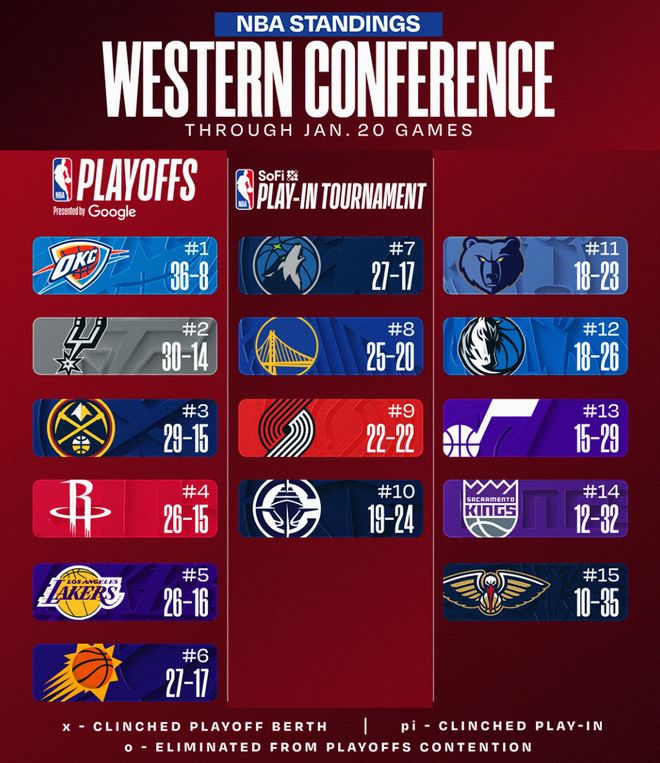 北京時(shí)間1月21日,NBA常規(guī)賽打完,西部的格局再度出現(xiàn)了變化,休斯頓火箭隊(duì)升至第四,洛杉磯湖人升至第五,菲尼克斯太陽(yáng)升至第六,森林狼則掉到第七,勇士則還是維持第八,快船艱難維持第十。