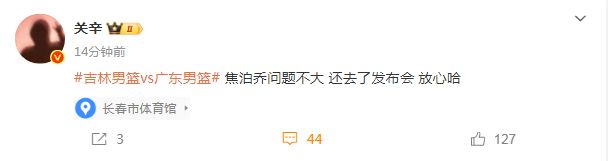 賽后,廣東男籃隊記關辛報道焦泊喬的傷病問題表示:“焦泊喬問題不大,還去了發布會,放心哈!”