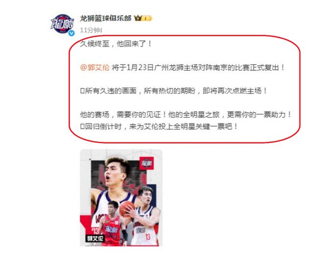 當然了,不管怎么說,廣州隊終于是迎來了一個好消息,沒錯,那就是郭艾倫已經完全康復,接下來,他將會再一次回到CBA賽場。