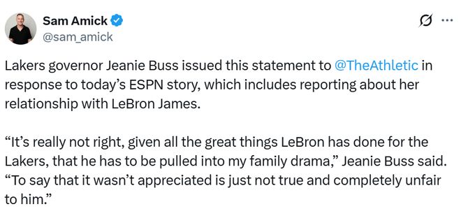 珍妮-巴斯就今日ESPN的相關報道,向The Athletic媒體發布聲明,該報道中包含了關于她與詹姆斯關系的相關內容。珍妮表示:“勒布朗為湖人立下了汗馬功勞,如今卻被卷入我們的家族紛爭,這實在太不應該了。說球隊不感激他的付出,這絕非事實,對他而言也極度不公。”