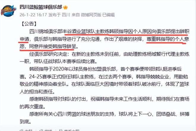 四川藍鯨籃球俱樂部官宣,主教練韓碩指導因個人原因向俱樂部提出辭職申請,俱樂部與韓指導進行了充分溝通,作出了艱難的抉擇,尊重韓指導的個人意愿,同意并接受韓指導辭呈。韓碩也將成為CBA第六個下課的主教練。韓碩辭職后,將由助理教練楊城暫時代理主教練職務。