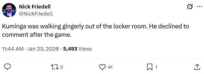 結(jié)果本場庫明加又半場傷退,賽后勇士記者Nick Friedell透露,庫明加一瘸一拐離開球館,并且拒絕了采訪,科爾表示庫明加將接受核磁共振檢查。