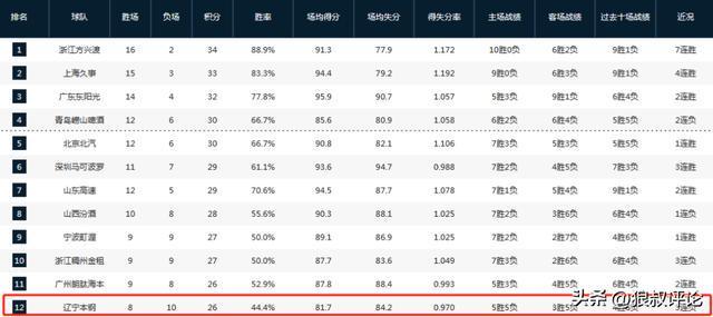 新賽季至今,遼寧取得8勝10負的戰績,跌至積分榜第12名。