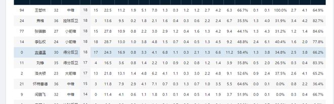 廣東男籃18輪下來,場均可得95.9分,場均投籃出手72.7次。其中外援薩林杰場均出手9.9次,場均15.1分;薩姆納場均出手14.8次,場均21.6分;奎因場均出手15.7次,場均20.1分;麥考爾一直因傷沒打,未參與數據統計。三外援合計場均出手40.4次,合計場均56.8分,