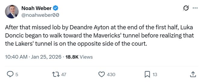 在比賽中場結束時,獨行俠隊記Noah Weber曝出東契奇直接朝著獨行俠的球員通道走去,突然意識到不對后,又轉身朝著位于球場的另一側的湖人球員通道走去。