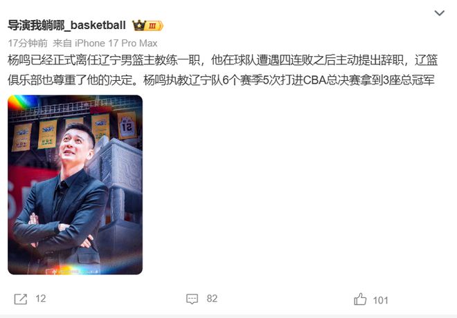 “知名”遼籃媒體人導演賽后直接確認了楊鳴下課的消息:楊鳴已經正式離任遼寧男籃主教練一職,他在球隊遭遇四連敗之后主動提出辭職,遼籃俱樂部也尊重了他的決定。