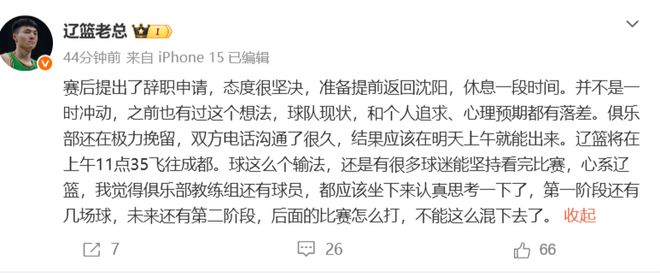 賽后第一時間,遼寧方面的媒體人爆出了一個猛料,據“遼籃老總”的消息,楊鳴在賽后已經提出了辭職申請,并且態度很堅決,準備提前返回沈陽,休息一段時間。楊鳴并不是一時沖動,之前也有過這個想法,球隊現狀,和個人追求、心理預期都有落差。俱樂部還在極力挽留,雙方電話溝通了很久,結果應該在明天上午就能出來。