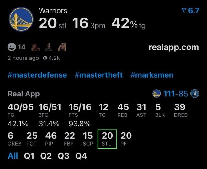 勇士今天搶瘋了,全隊20次搶斷,創本賽季至今所有比賽搶斷紀錄,庫里和波姐都有4次,森林狼似乎籠罩著無心戀戰的陰影,全隊多達25次失誤,華子一人就失誤8次之多。