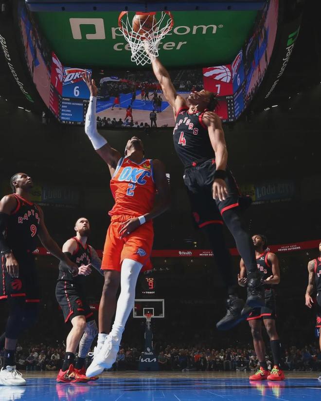 我們先來說說雷霆和猛龍這一場,本賽季的猛龍并不弱,長期排名東部前三。四節比分(猛龍在前):25-30、29-20、25-31、24-20。末節最后2分鐘,奎克利兩記大心臟三分幫助猛龍反超,最后28秒斯科蒂-巴恩斯大帽霍姆格倫!