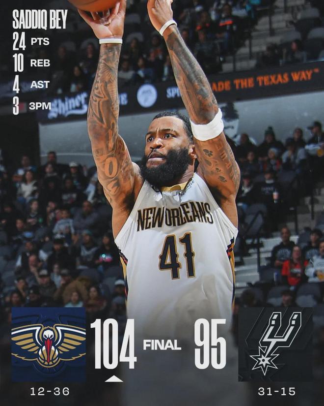四節比分(鵜鶘在前):25-28、31-19、26-21、22-27。第四節馬刺轟出一波24-5,一度完成反超。但鵜鶘還了一波13-0,直接帶走比賽勝利。福克斯8中4得到12分7助4失誤,罰球4中1;卡斯爾投籃6中1僅得5分4板5助2失誤。