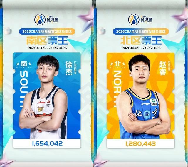 今天下午,CBA聯(lián)賽官方正式公布2026年CBA全明星賽首發(fā)球員票選結(jié)果。廣東隊后衛(wèi)徐杰以1,654,042票當選南區(qū)票王及總票王,北京隊后衛(wèi)趙睿則以1,280,443票榮膺北區(qū)票王。