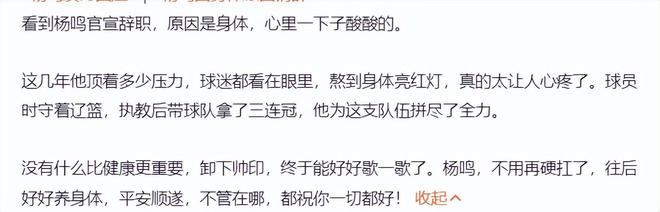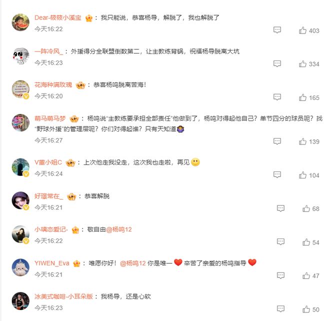 不少的球迷都在遼寧男籃官方下恭喜楊鳴脫離苦海,楊鳴指導解脫了,球迷們也解脫了。