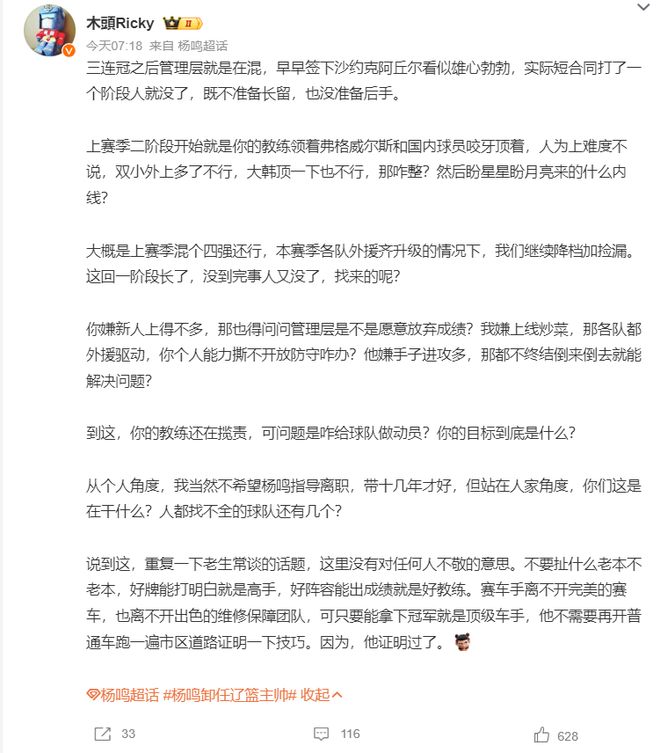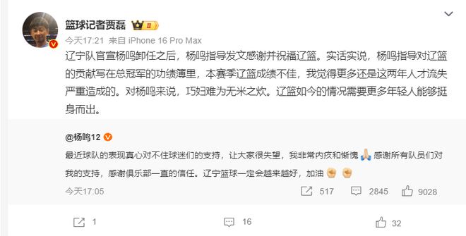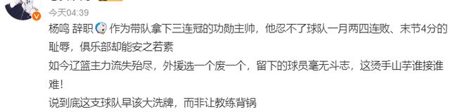 大V們紛紛不滿遼籃管理層的做法,他們認為楊鳴淪為了俱樂部的替罪羊:
