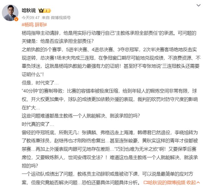 哈秋:楊鳴該為遼籃承擔全部責任嗎?在爭冠窗口期兌現成績,不浪費資源、不辜負球迷,楊鳴的執教能力是得到一致認可的,毫不夸張的說三連冠教頭還需要證明什么?