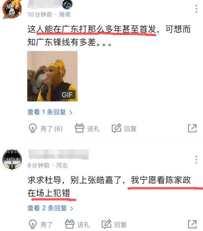 在本輪廣東以9分險勝天津的比賽中,張皓嘉替補出戰14分鐘,期間1投0中,只拿到2籃板1助攻,防守端可以說是負作用,進攻端甚至畏懼于出手,這也讓不少廣東球迷感到唏噓:“這人能夠在廣東打那么多年甚至首發,可想而知廣東鋒線有多差”、“求求杜導,別上張皓嘉了,我寧可看到陳家政在場上犯錯。”