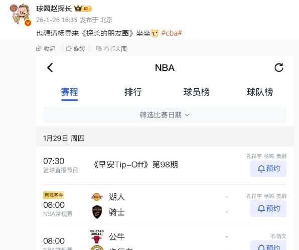 根據媒體人球圈趙探長報道,楊鳴辭職之后,他將火線重回解說席位,將在1月29日與美娜、孔祥宇,一起解說1月29日湖人對陣騎士的焦點NBA比賽。