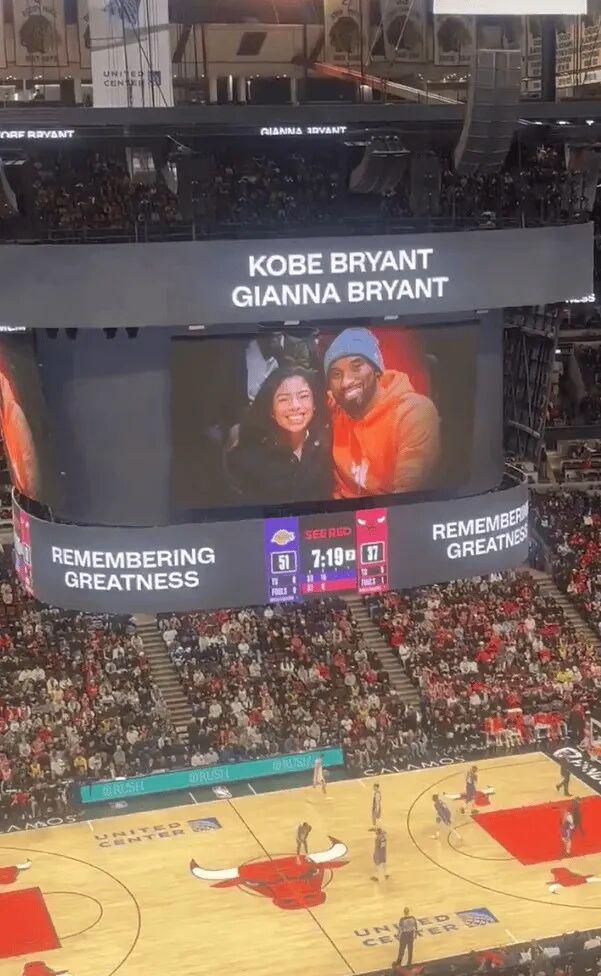 聯(lián)盟在六年后的今天安排了湖人與公牛的比賽,主場(chǎng)的大屏展示科比與GG的照片依然那么慈祥。